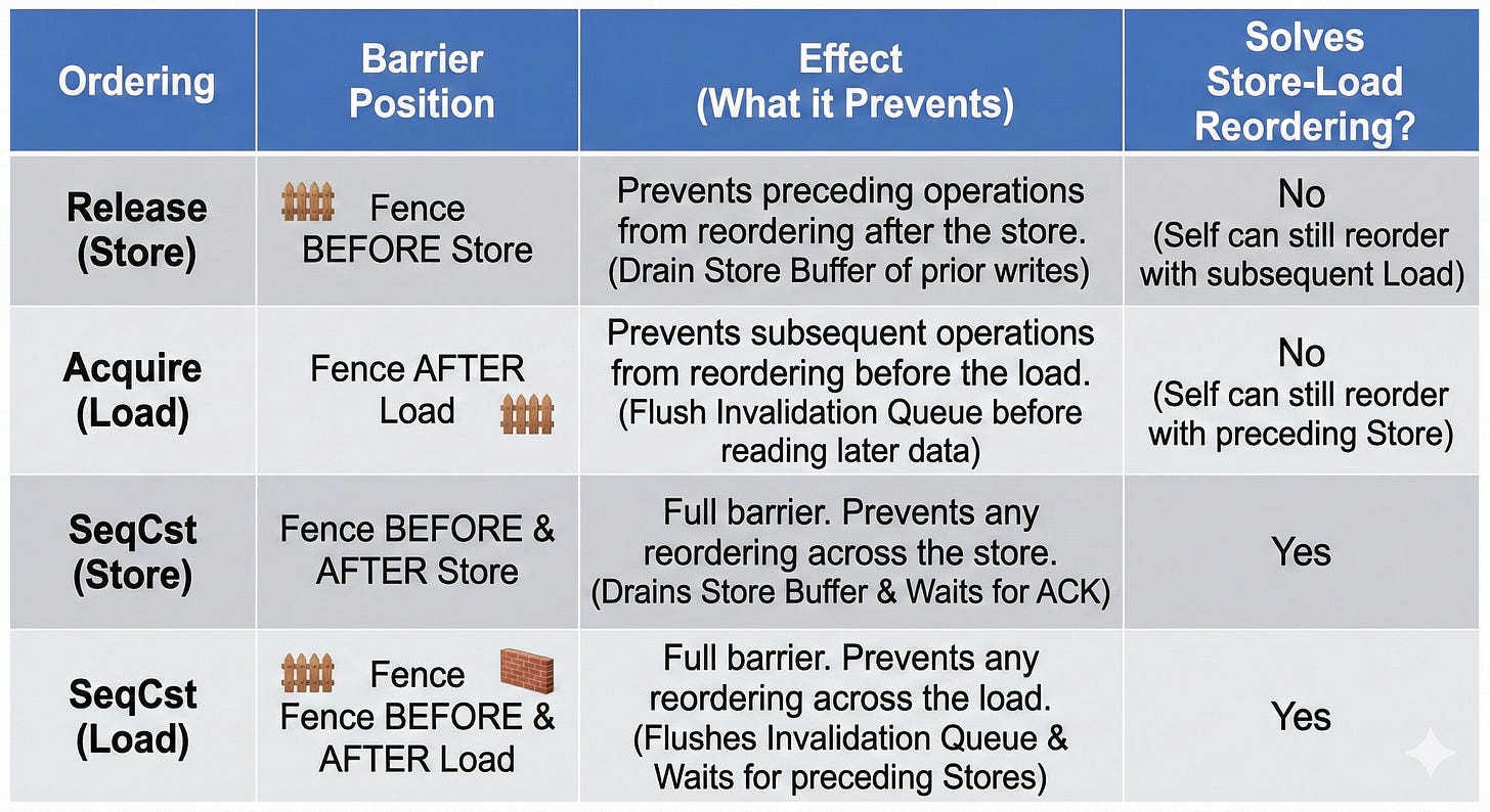 但像 rust 更底層的語言就支援其他 atomic barrier 機制,例如 Release/Acquire ,Release 是在 STORE 之前設置 barrier,Acquire 在 LOAD 之前設下 barrier。