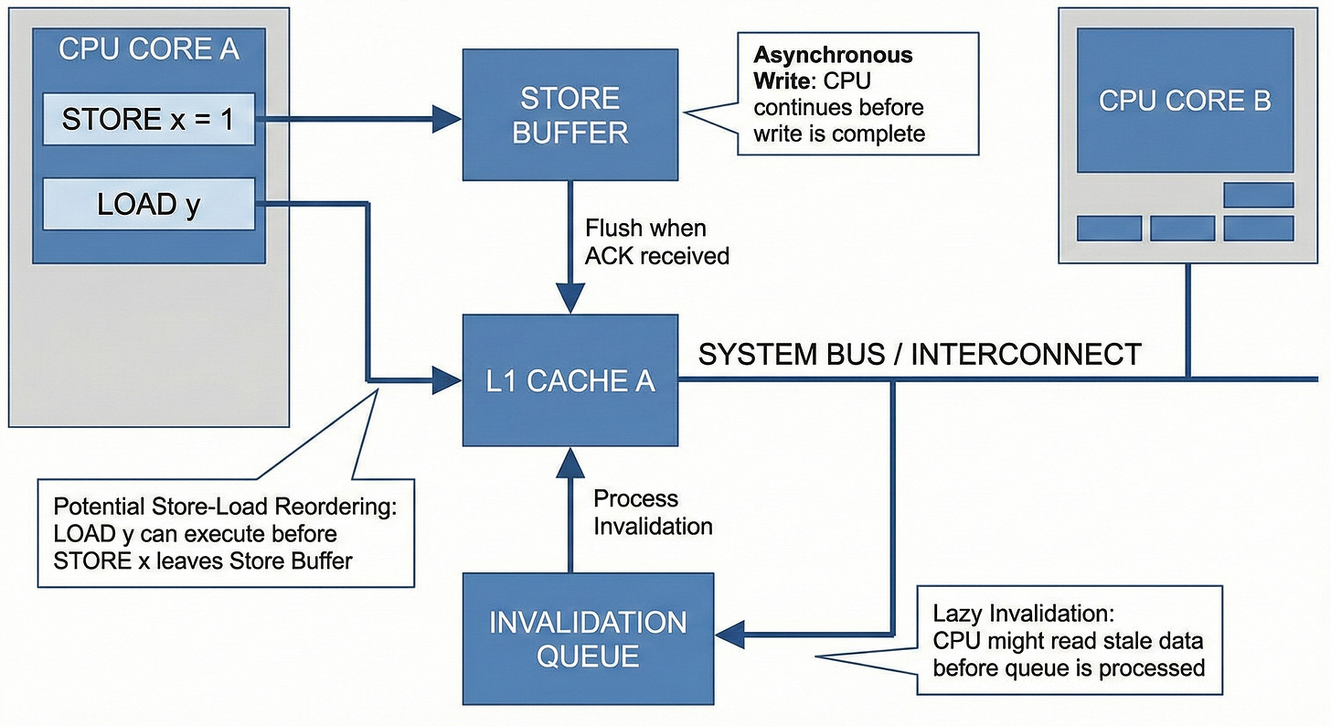 STORE register => bSTORE 1 要等 ACK,先放到 store buffer 往下執行 LOAD y,如果 y 的 cache line 狀態是 E or S 就可直接放到 register,然後再回去執行 STORE 1 => a 跟 STORE register => b。