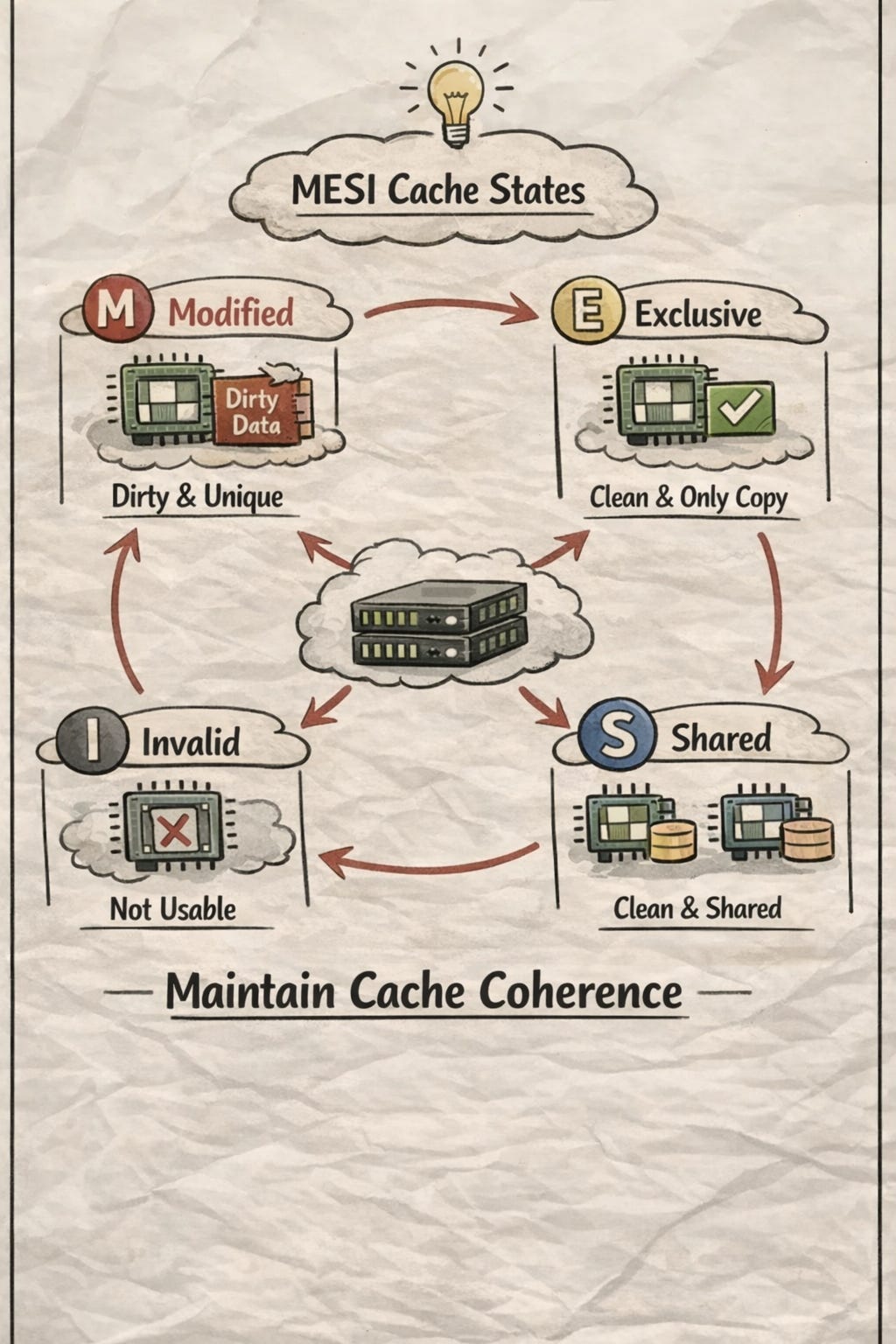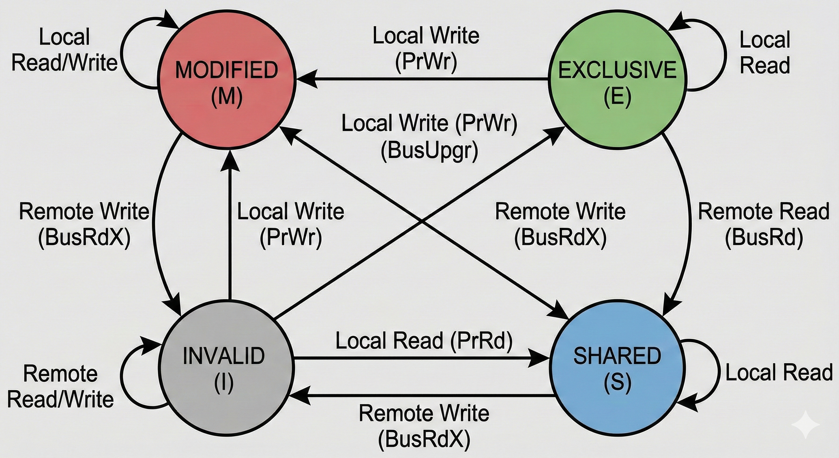 MESI 是 cache line 的狀態機,定義了 cache line 狀態的切換: