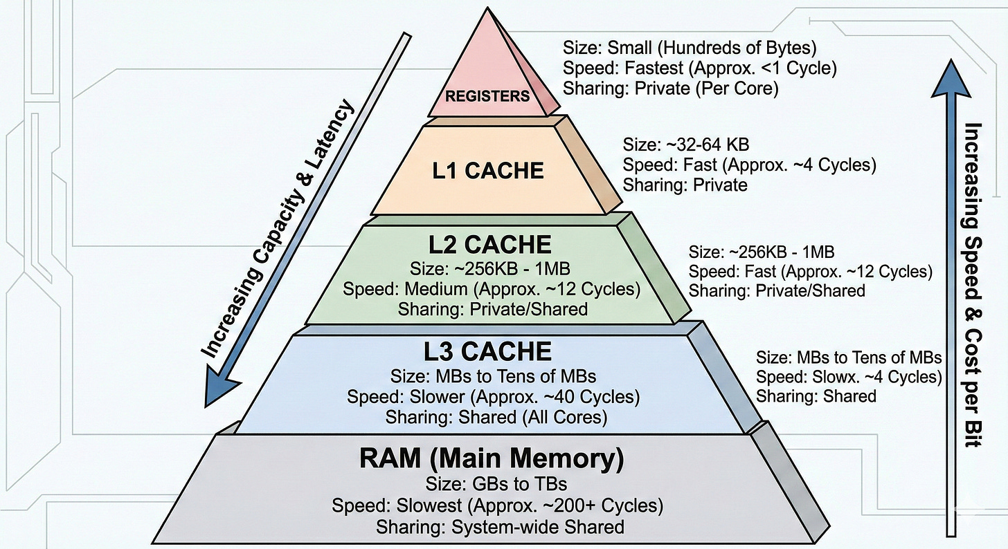 由於受限硬體電路的物理限制,記憶體容量越大,CPU 存取延遲越高,因此 CPU 採用多層記憶體階層(memory hierarchy)來降低平均存取成本。