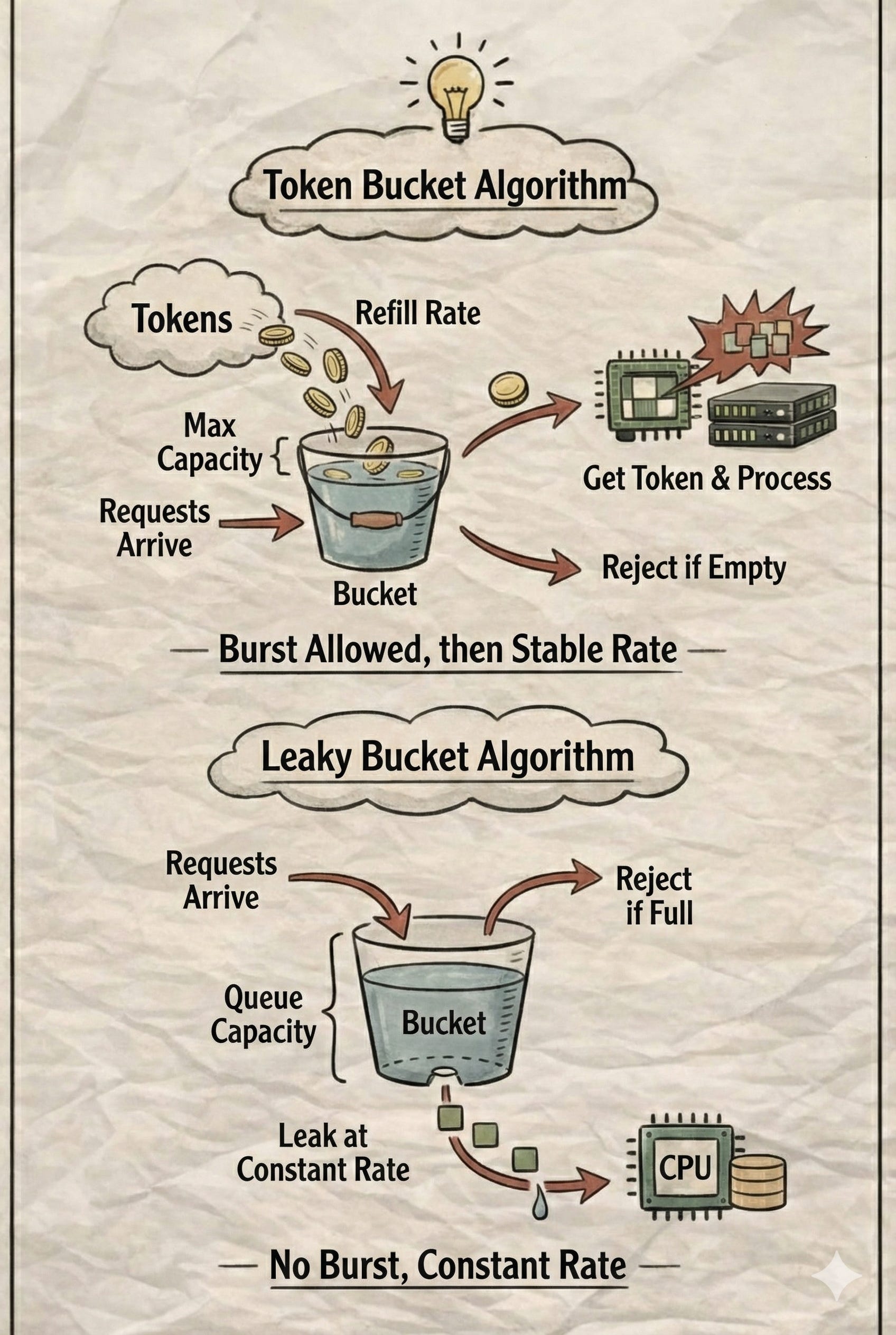 If your system strictly cannot allow bursts, you should use the Leaky Bucket instead. Imagine a bucket with a fixed capacity and a hole at the bottom. Requests enter the bucket and are "leaked" (processed) at a constant, predetermined rate.