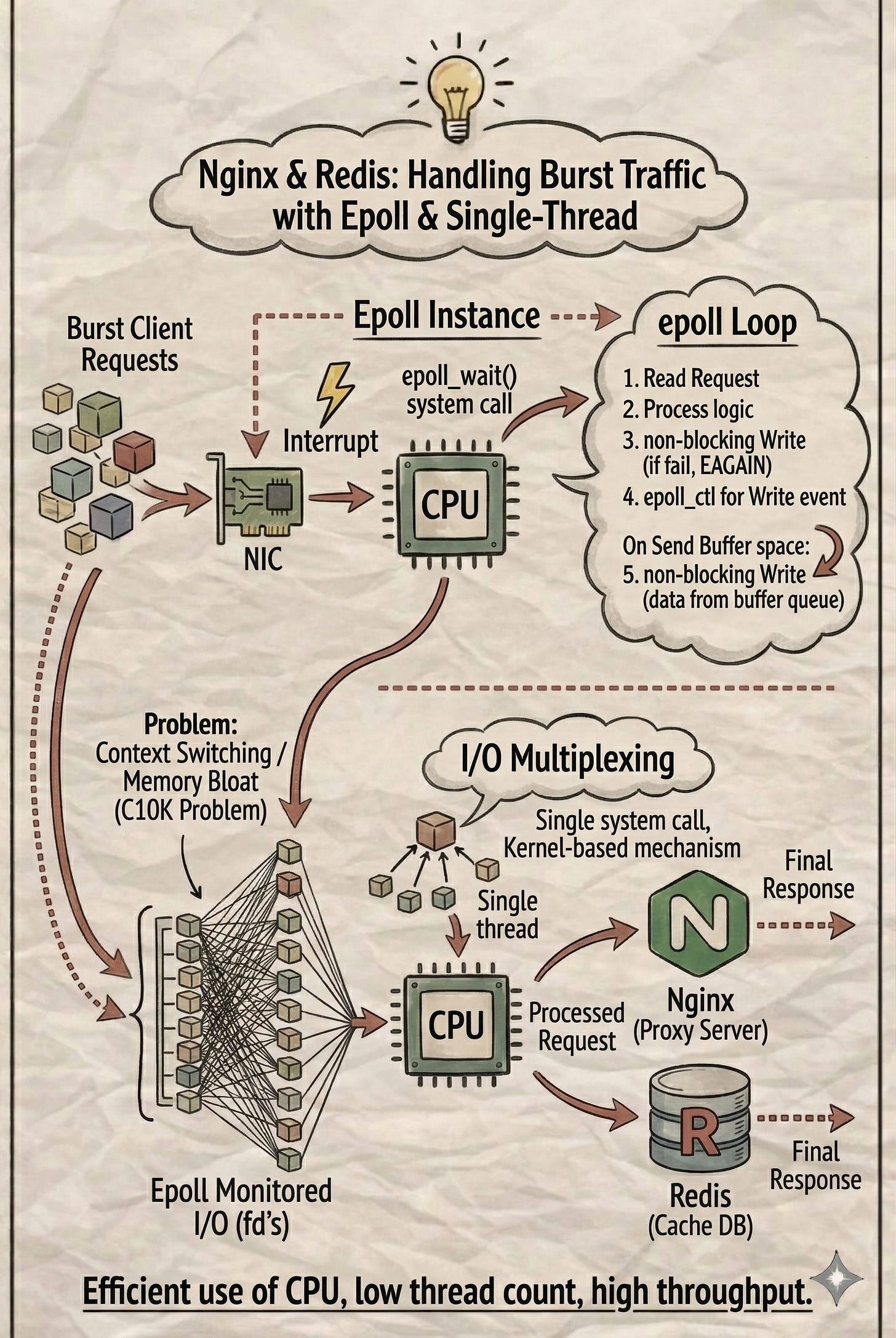 Nginx 是轉發請求的高效代理伺服器,Redis 則是快取資料庫的王者,它們在單次請求的處理速度都極快,因為幾乎完全避開了造成瓶頸的硬碟 I/O。