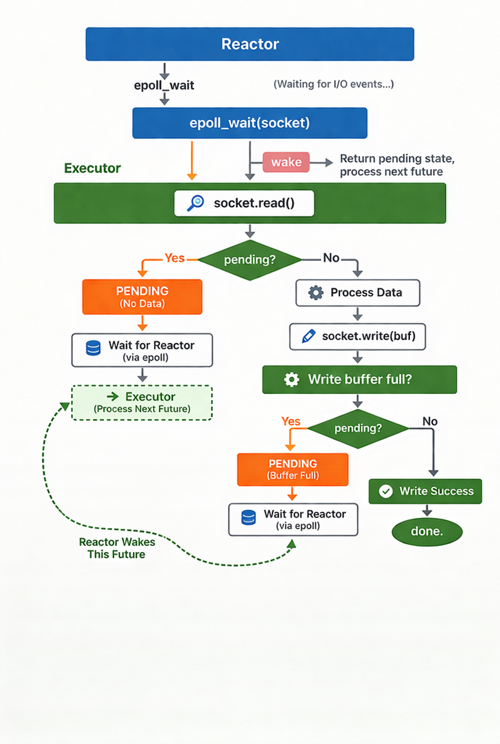 └── non_blocking_write() → WouldBlock → register epoll socket read 若沒資料,會放到 epoll 等 reactor 通知,此時 executor 收到 socket.read() return 的 pending 狀態後會處理下一個連線的 future,等 reactor 喚醒該 future 後往下處理進行 write,同樣若 write buffer 滿了會回 pending 等 reactor 再次喚醒才寫入成功。