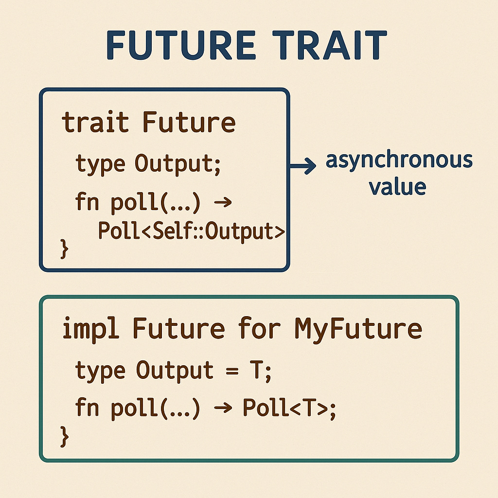 而在 Rust 生態系中,將被 reactor 元件所管理的事件狀態,抽象化成 Future trait,該介面代表 async 操作,透過執行 poll 來實際執行 Future 內部邏輯。